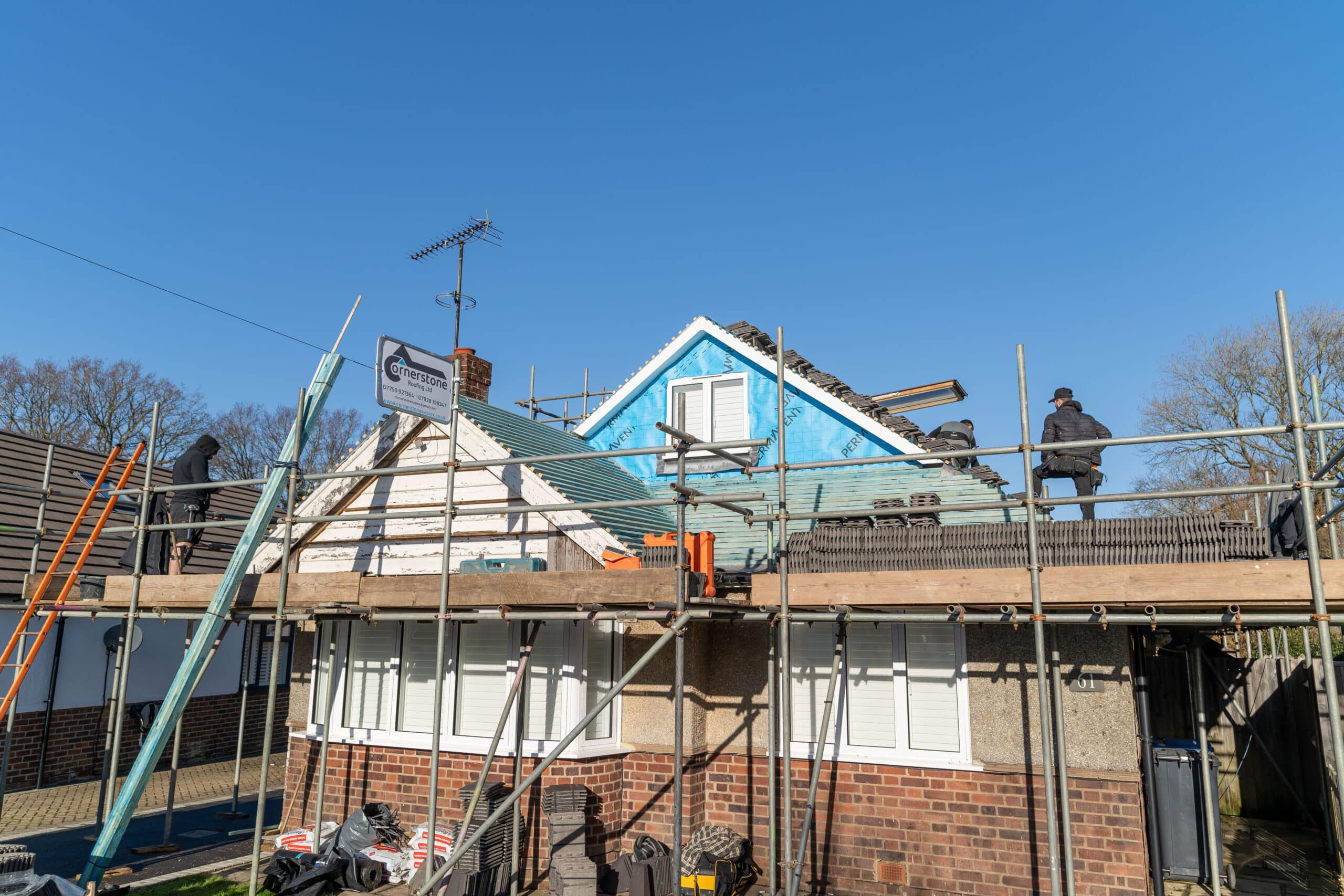 Our roofers are always available to respond to emergency repairs in Mid Sussex. Over time, even the most expertly fitted and highest grade roofs can encounter issues or sustain damage due to harsh weather conditions. At Cornerstone Roofing in Mid Sussex, serving areas like Haywards Heath and Burgess Hill, we offer a thorough roofing repair service. Our team conducts a detailed inspection to identify any damage or defects in your roof. Following the assessment, we provide professional advice and perform necessary repairs. In cases of urgent roof repair needs, particularly when the damage is significant, we might implement a temporary fix to mitigate further issues until a complete repair can be executed.
